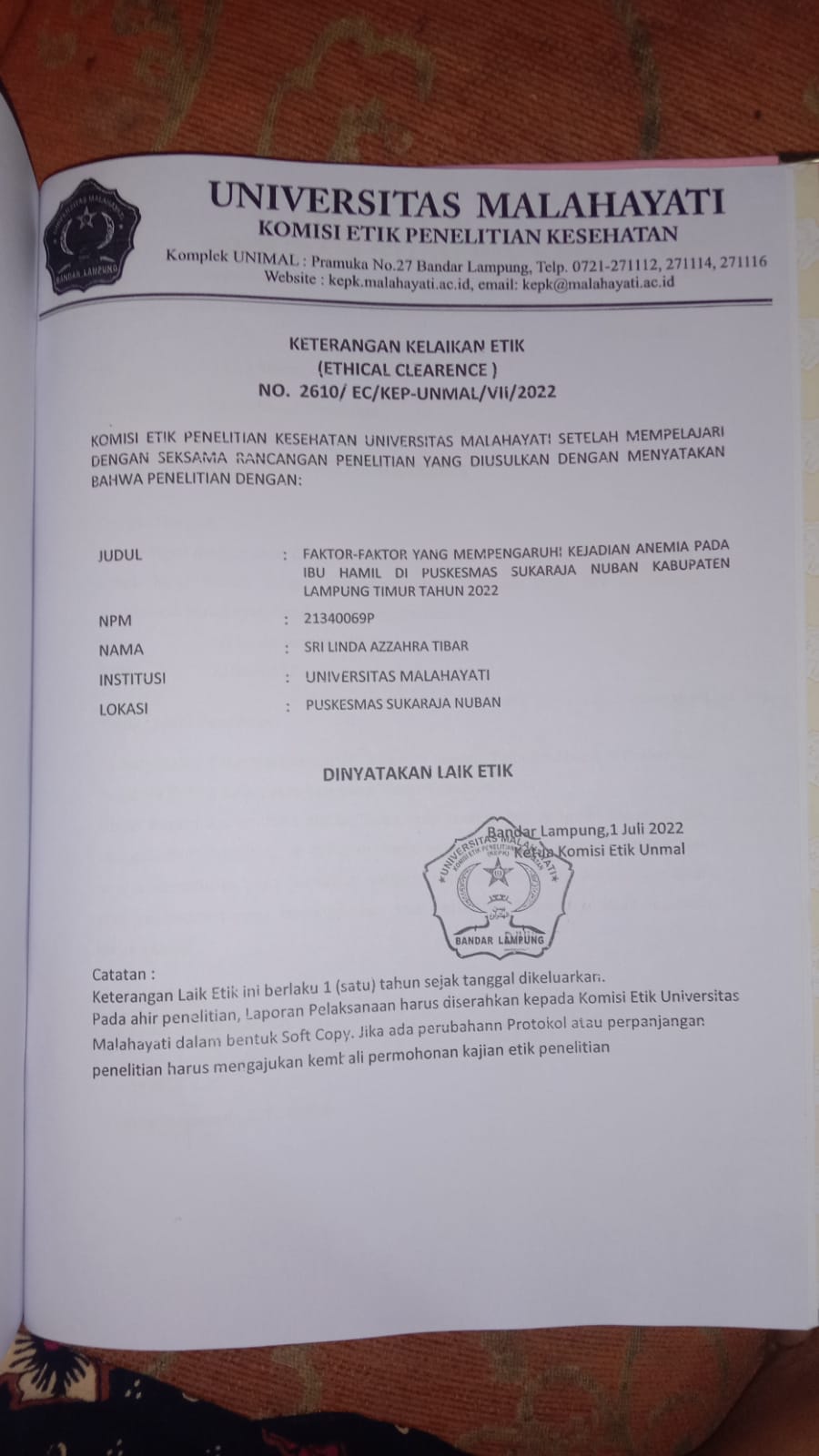 Purpose:To determine the factors affecting the incidence of anemia in pregnant women at Sukaraja Nuban in-patient public health center, Lampung Timur Regency in 2022.